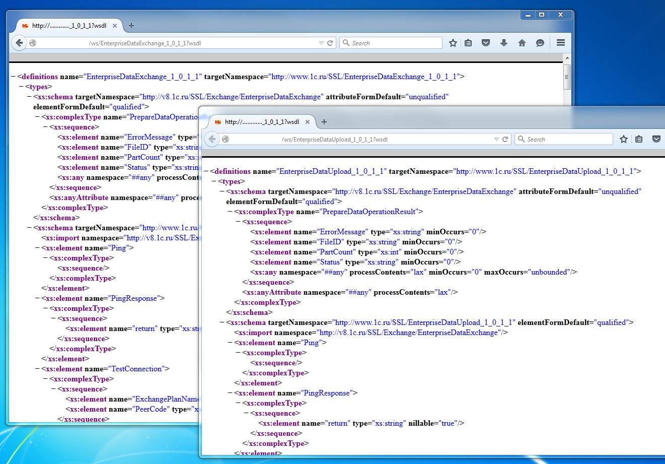 На стороне конфигурации должны быть развернуты веб-сервисы EnterpriseDataUpload и EnterpriseDataExchange соответствующих версий (в данном случае была использована версия 1.0.1.1). При открытии этих двух URL-адресов в браузере (нужно подставить правильное для вашей инсталляции «1С:Предприятия» имя веб-сервера и публикации):