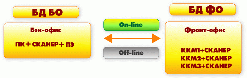 В рамках одного торгового комплекса принято разделять работу фронт-офиса и бэк-офиса. В задачи фронт-офиса входит автоматизация рабочих мест, которые в своей работе связанны с действиями над товарами или взаиморасчетами с покупателями. В задачи бэк-офиса входит подготовка данных для бесперебойной работы фронт-офиса, а так же обработке информации полученной при его работе.