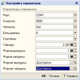 В данном случае терминал подключен к последовательному порту COM1, скорость обмена данными с ТСД составляет 115200 бод. Полученные данные необходимо указать в форме настройки параметров обработки обслуживания.