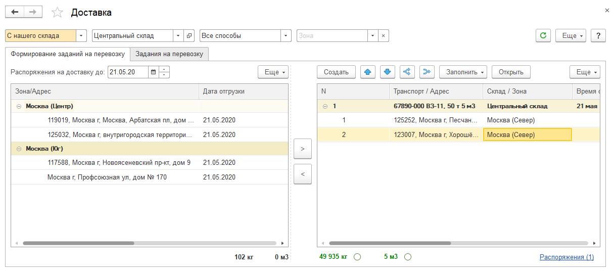 Управление доставкой осуществляется путем формирования Заданий на перевозку. Задания формируются менеджером по доставке в специальном рабочем месте Доставка с учетом зоны доставки, порядка объезда адресов доставки, а также с учетом объема и веса груза, вместимости и грузоподъемности транспортного средства.