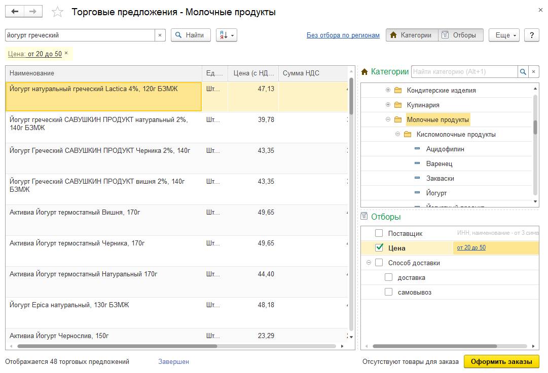 Покупатель может найти предложение, используя форму поиска Закупки – Работа с поставщиками - Торговые предложения 1С:Бизнес-сеть. В форме возможен поиск по наименованию и по категории товаров. Дополнительно можно установить отборы по региону, по цене и другим параметрам.