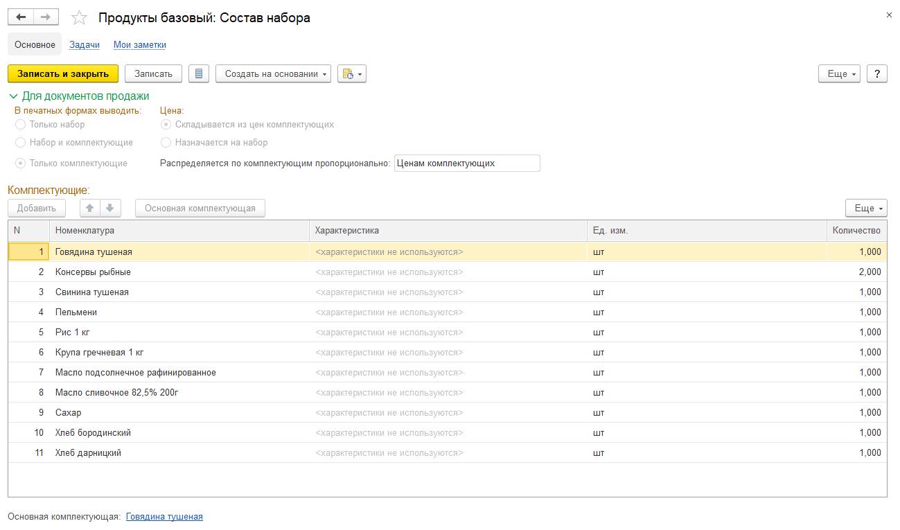 Для работы с такими наборами в конфигурациях предусмотрены отдельный тип номенклатуры - динамические наборы. Использование наборов включается функциональной опцией НСИ и администрирование – Настройка НСИ и разделов – Номенклатура – Разрезы учета – Наборы номенклатуры при продаже. Для наборов создается новый вид номенклатуры, в котором указан тип Набор, а каждый набор задается как отдельная карточка номенклатуры, для которой указывается Состав набора.