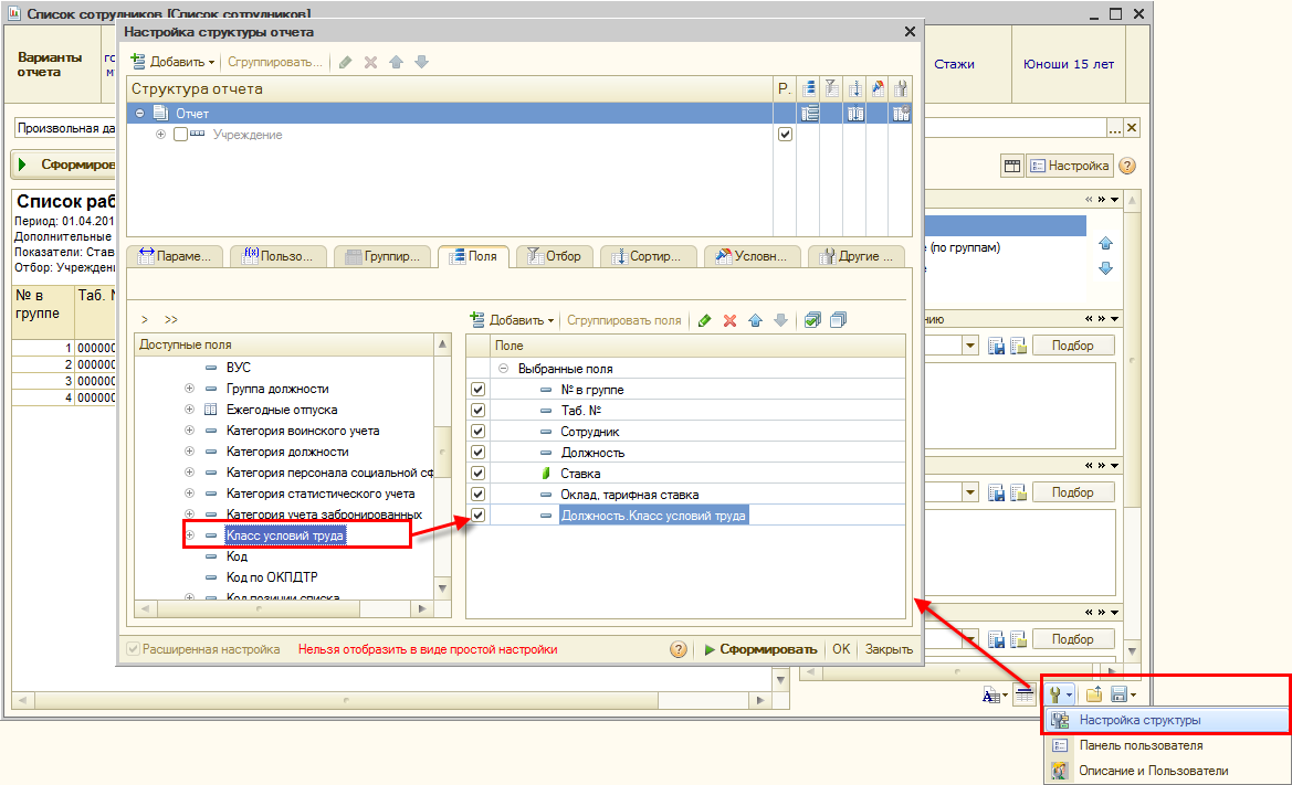 По просьбе пользователей в организациях, применяющих результаты оценки условий труда, в доступные при настройке вариантов отчетов данные добавлены указанные для должностей организаций классы условий труда. Сведения о классе условий труда реализованы в виде свойства должности в следующих отчетах: