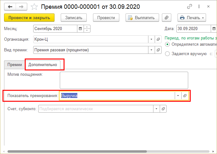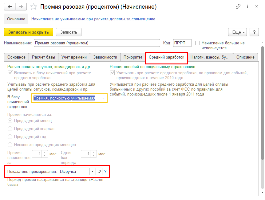 Теперь можно указать, за какой показатель начисляется премия: на закладке "Дополнительно" документа "Премия", либо на закладке "Средний заработок" в карточке начисления премии.