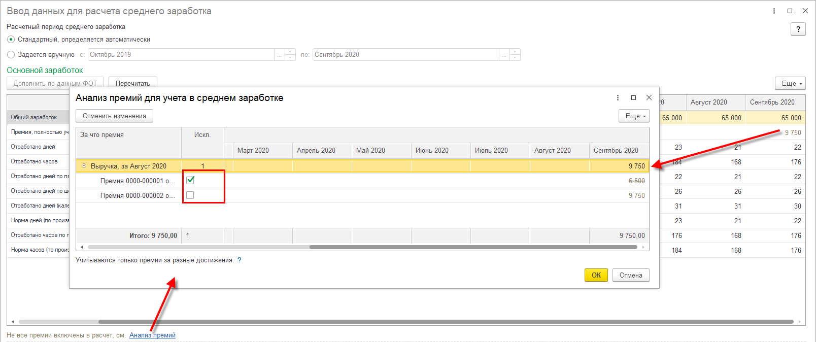 Если показатель указан, и в одном месяце начислено более одной премии за один и тот же показатель и период, то при расчете среднего заработка по умолчанию учитывается только одна из них (наибольшая). При необходимости можно изменить учитываемую премию по ссылке "Анализ премий" в калькуляторе среднего заработка. Она появляется в случае, если есть исключенные премии, а также всегда доступна в меню "Еще".