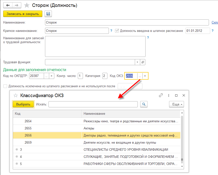 Реализована возможность заполнения кодов ОКПДТР и ОКЗ в карточке должности выбором из соответствующего классификатора.