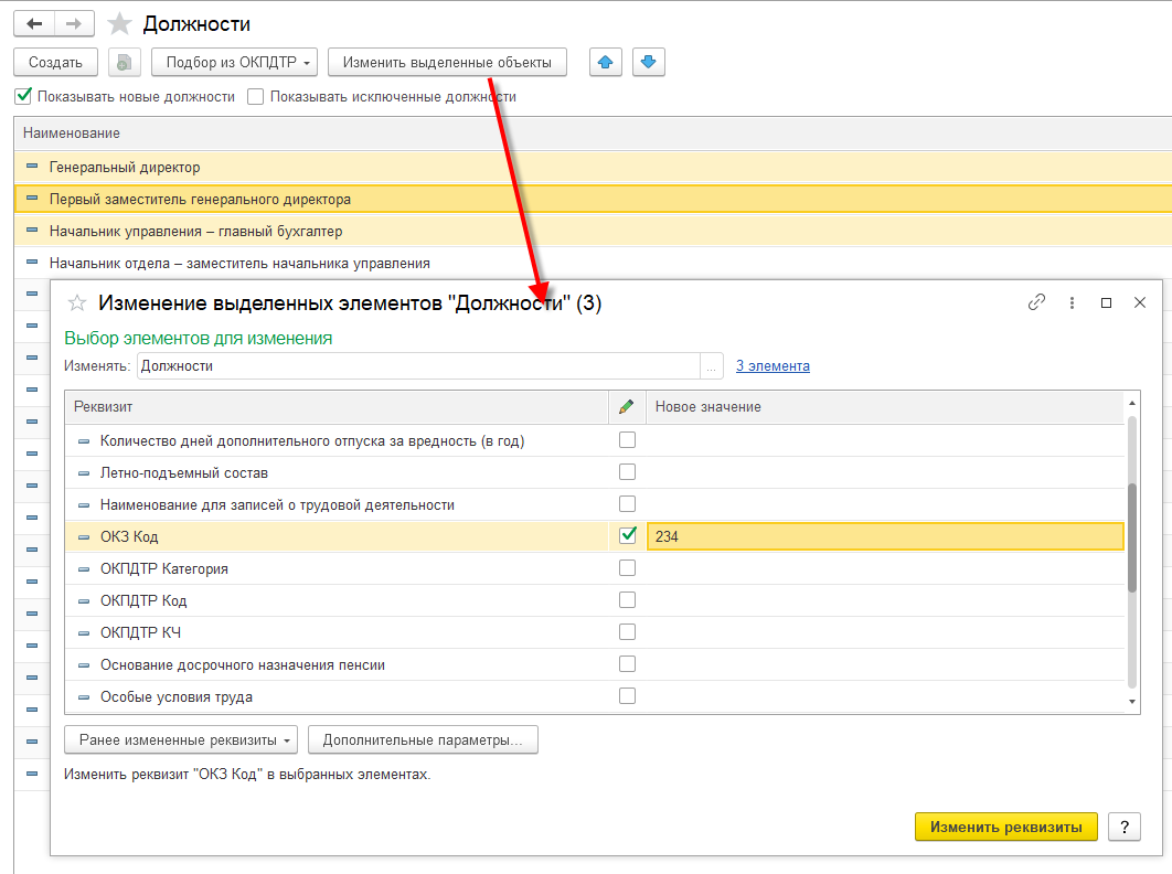 А также возможность массового заполнения кодов и других реквизитов должности по кнопке "Изменить выделенные объекты" в списке должностей.