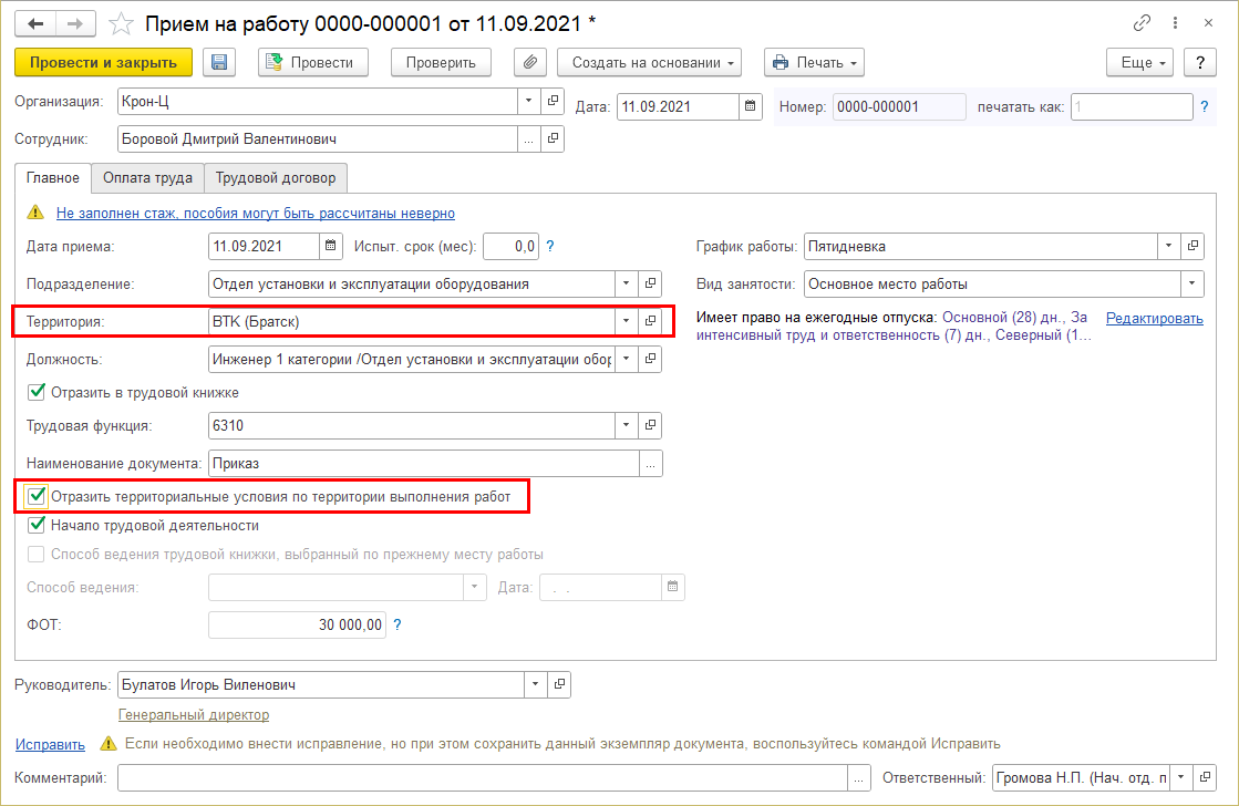 Если используются обособленные территории, в кадровых документах появляется флажок "Отразить территориальные условия по территории выполнения работ". При его установке территориальные условия в мероприятии прописываются именно из территории, а не из подразделения или организации.