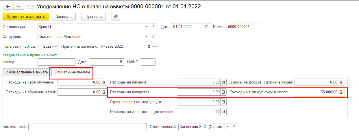 В соответствии с Федеральным законом от 05.04.2021 № 88-ФЗ предоставлена возможность регистрировать в качестве социального вычета расходы сотрудников на физкультурно-оздоровительные услуги. Добавлен новый код социального вычета 329. Сумма по нему вводится в документе "Уведомление НО о праве на вычеты" на странице соц. вычетов, далее используется так же как имевшиеся ранее соц. вычеты.