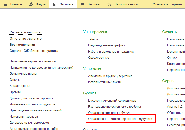 При использовании универсального формата обмена появляется новый документ "Отражение статистики персонала в бухучете" (раздел Зарплата – Бухучет) для передачи сведений о среднесписочной численности в бухгалтерскую программу. Документ вводится по организации один за месяц.