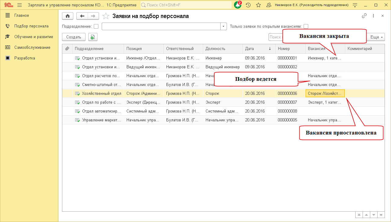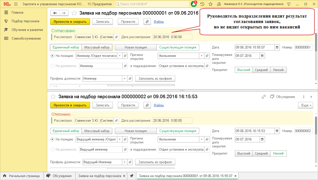 Пользователь работает с Заявками на подбор персонала и видит результат их согласования.