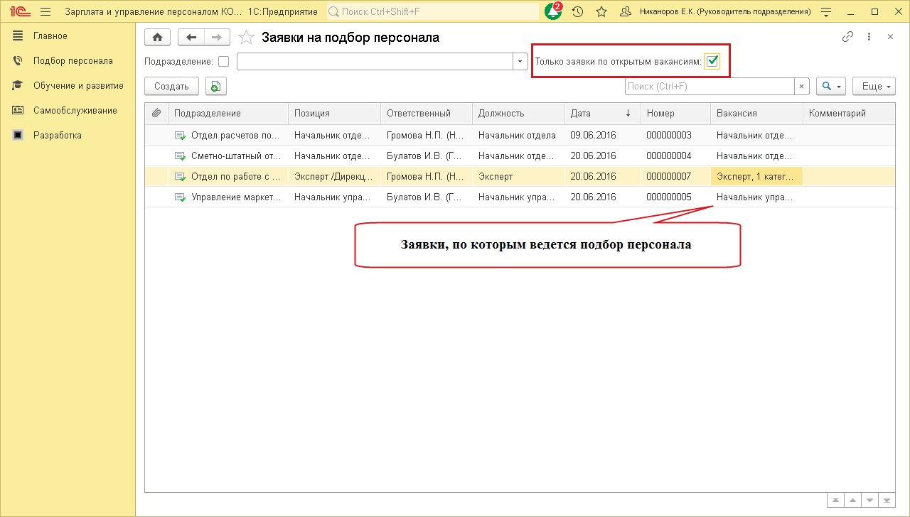 Теперь над списком Заявок на подбор персонала появился флажок Только заявки по открытым вакансиям. После его установки в списке остаются только заявки, по которым ведется подбор.