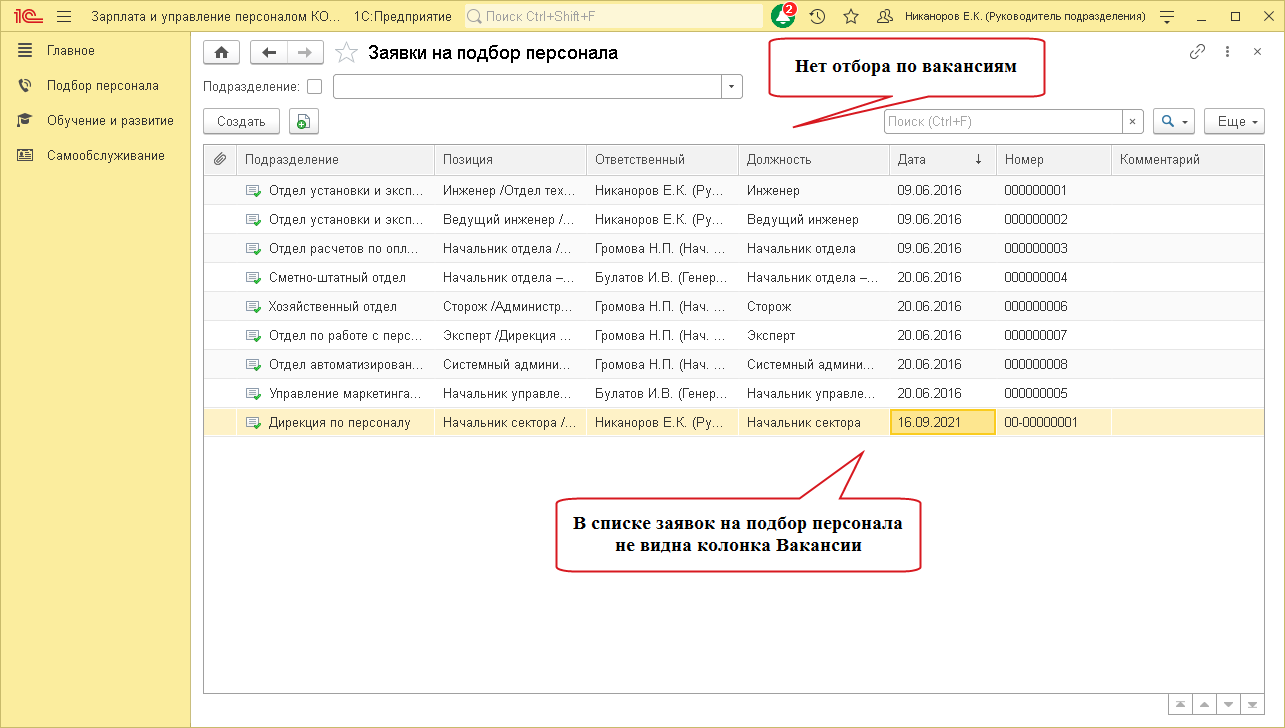 Так увидят список заявок участники подбора с правами на Заявки на подбор персонала и на Вакансии.