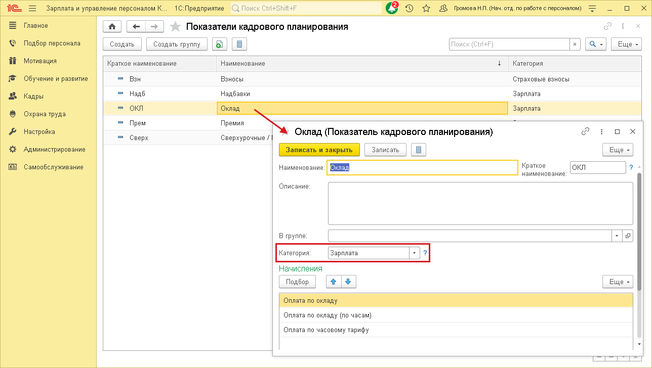 Показатели категории Зарплата - это список начислений. Например, показатель Оклад включает в себя: