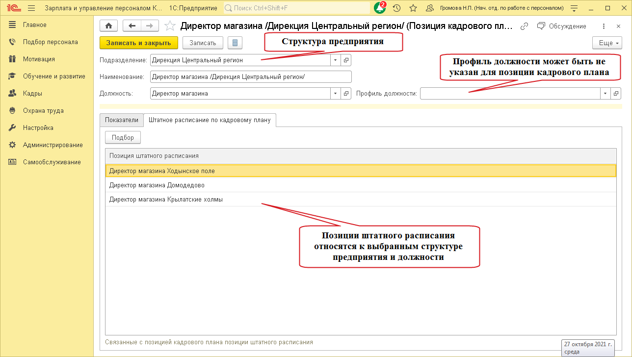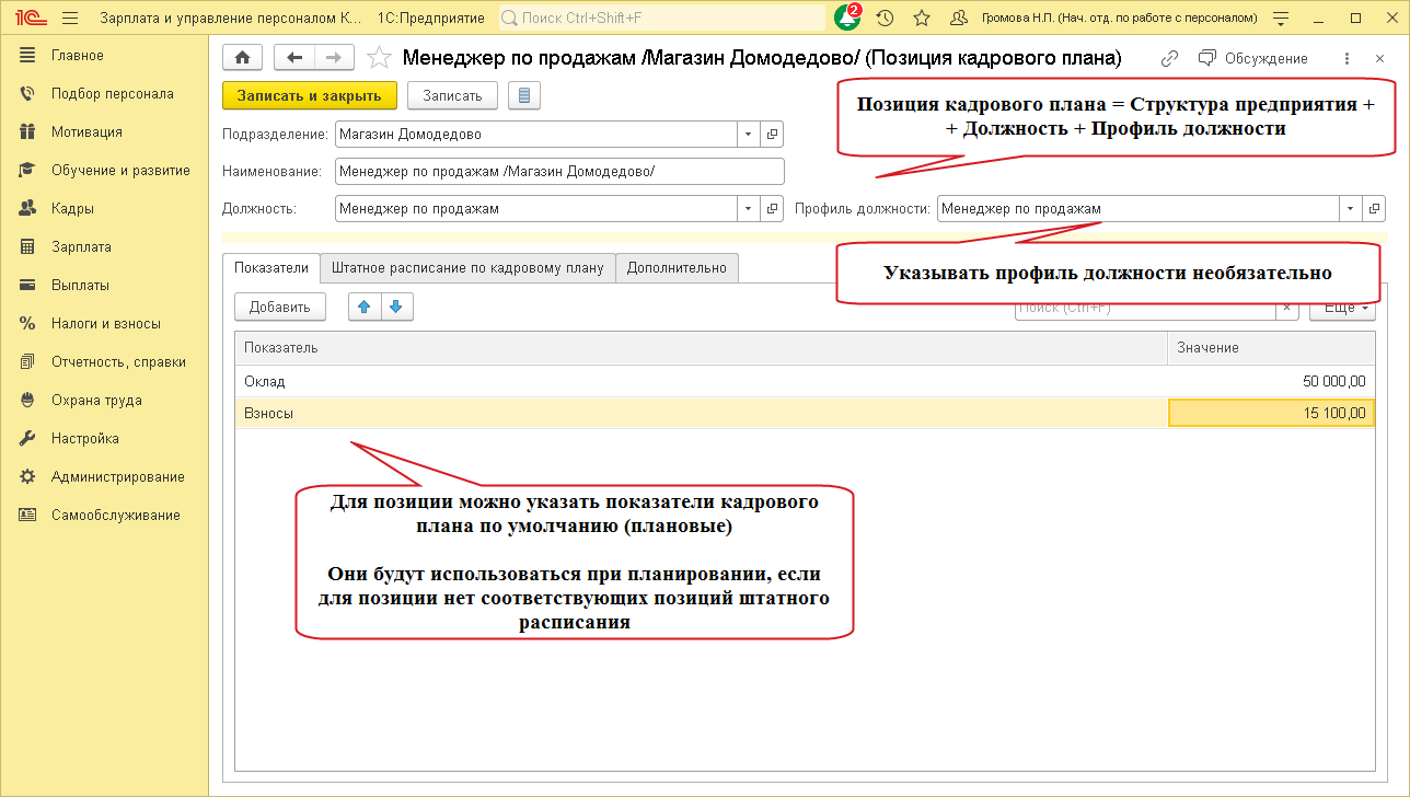 Позиция кадрового плана = Структура предприятия + Должность + Профиль должности (профиль можно не указывать).