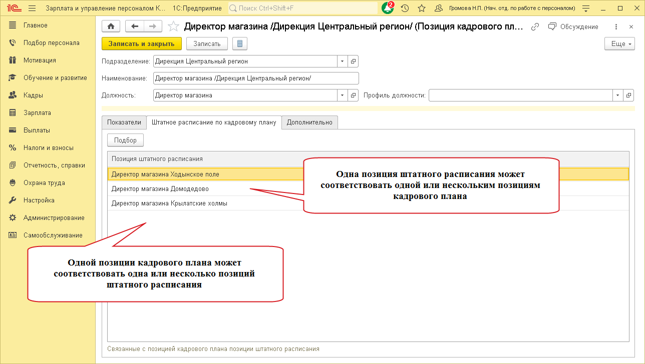 Одна позиция штатного расписания может соответствовать одной или нескольким позициям кадрового плана.