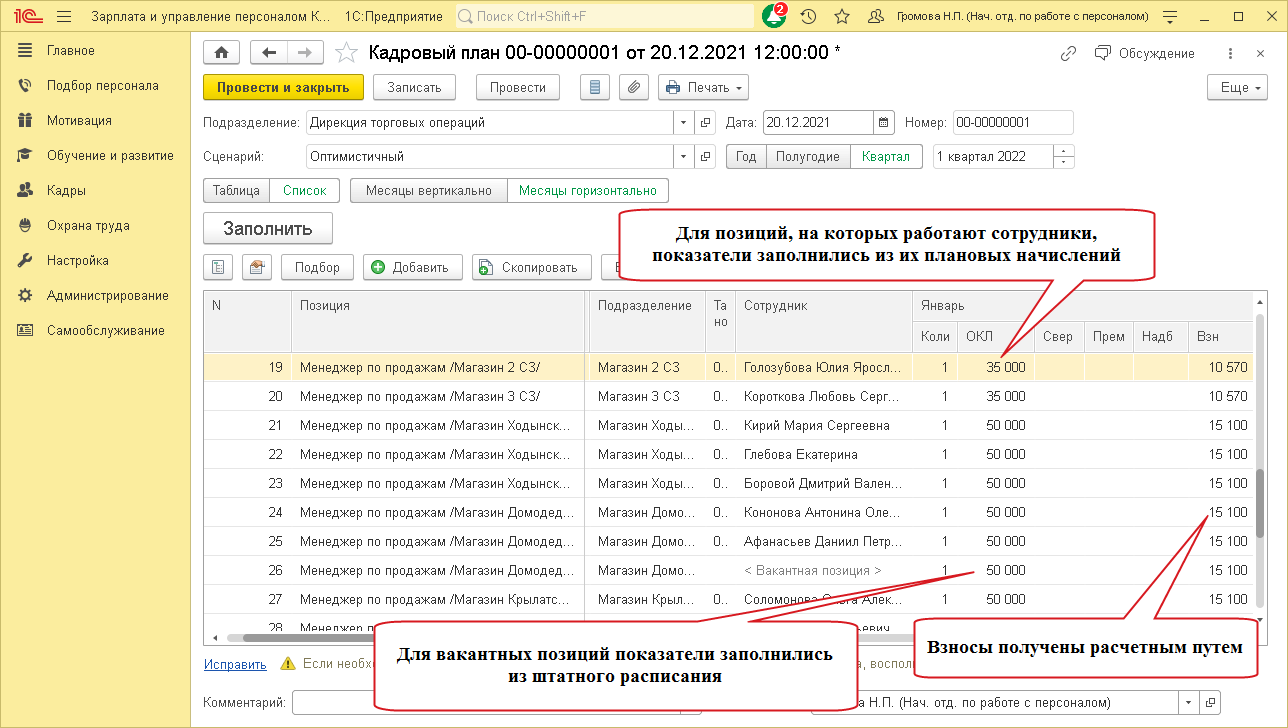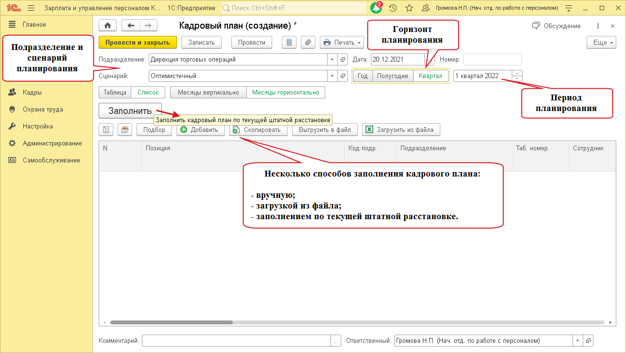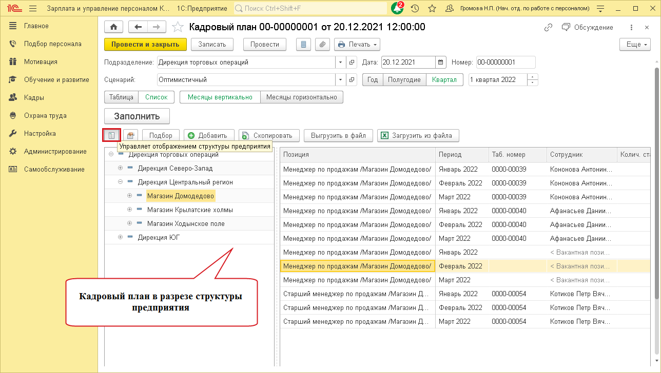 Например, кадровый план создают в 1С:ЗУП КОРП впервые. Поэтому все позиции кадрового плана Дирекции торговых операций при заполнении создаются автоматически.