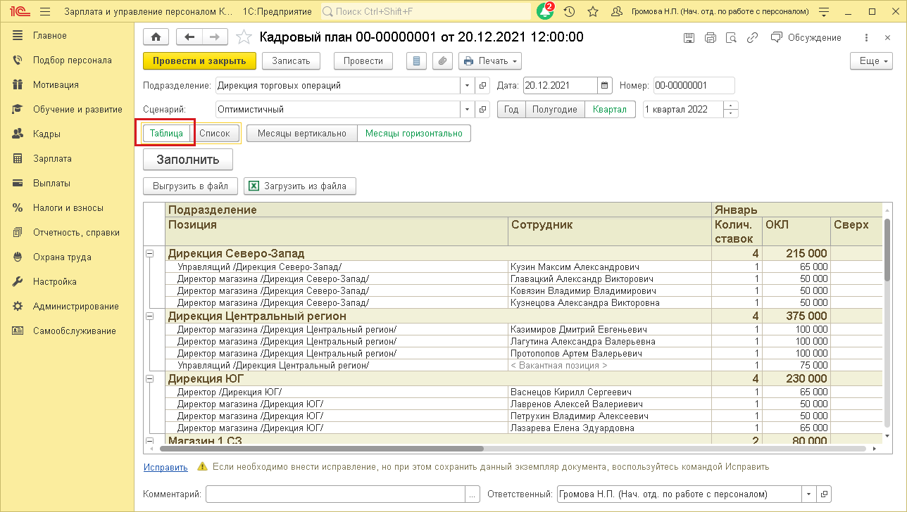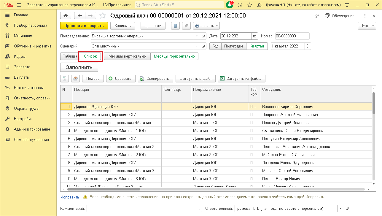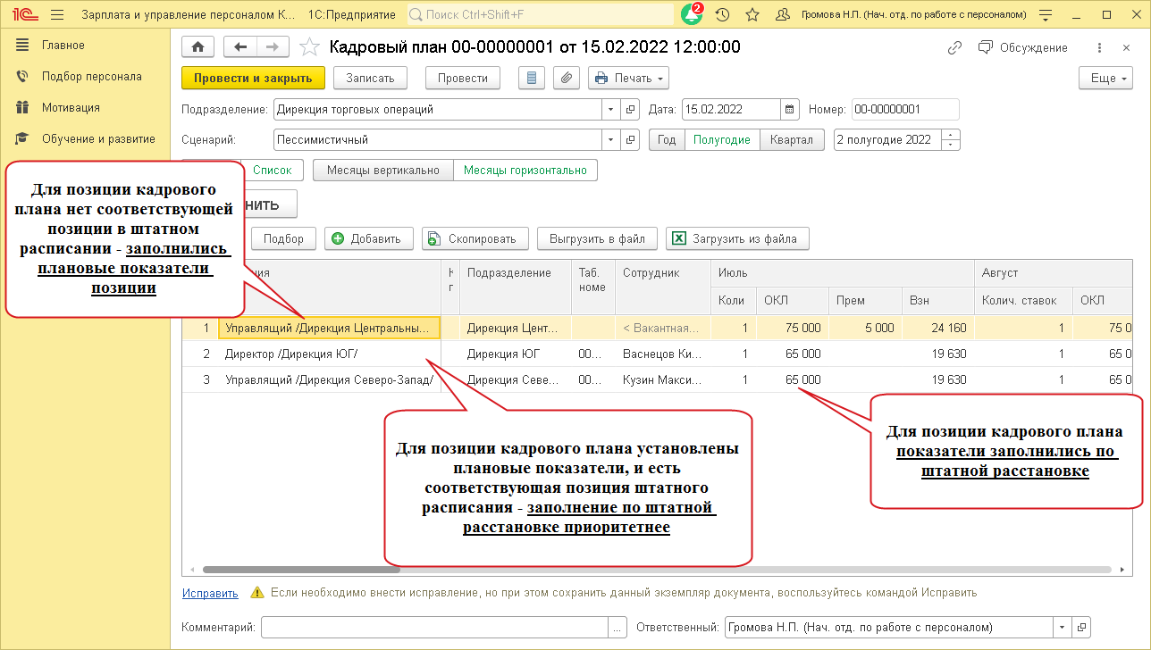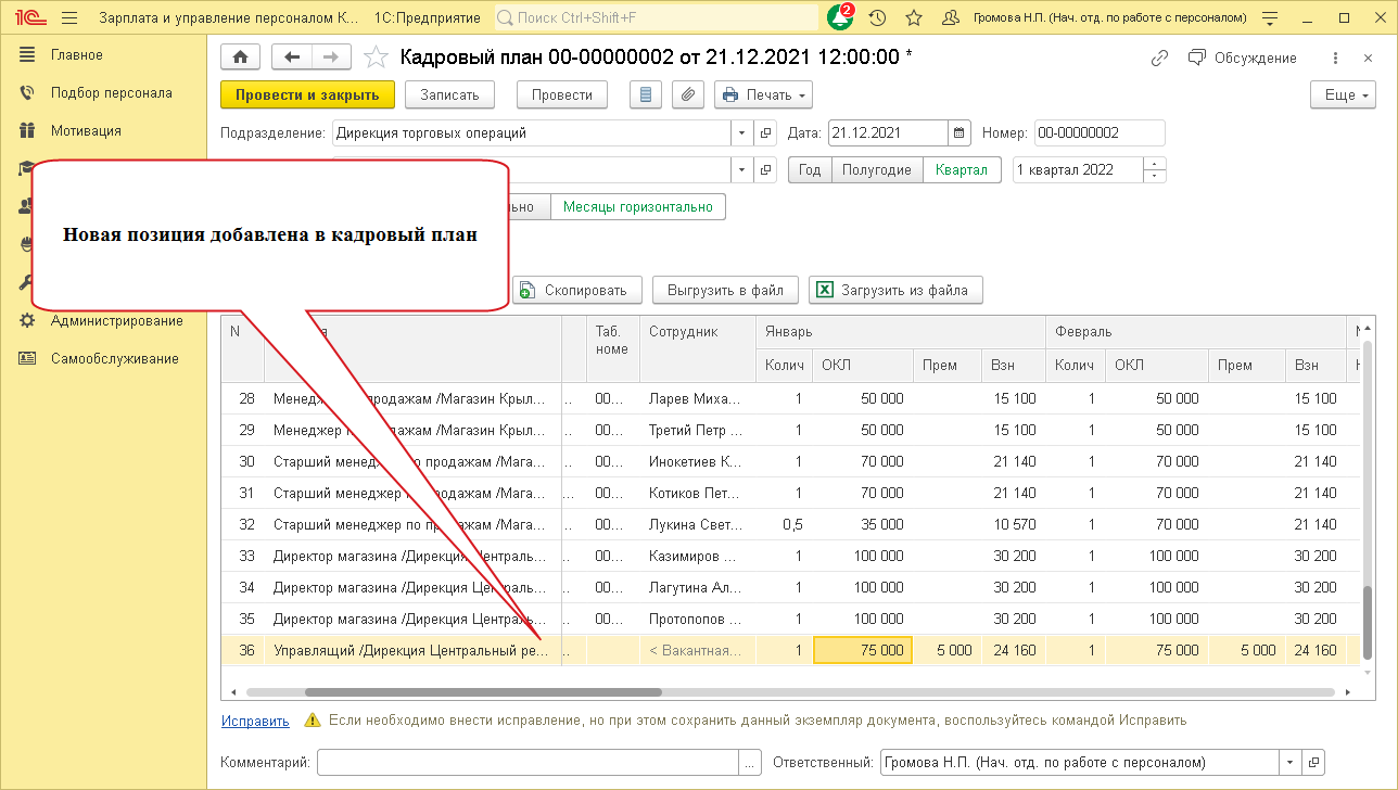 Например, кадровый план создают в 1С:ЗУП КОРП впервые. Поэтому все позиции кадрового плана Дирекции торговых операций при заполнении создаются автоматически.