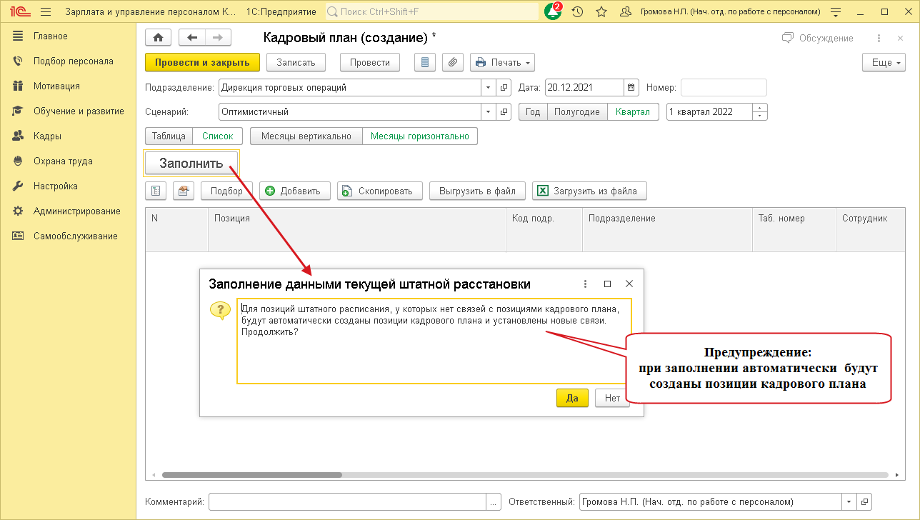 Перед началом заполнения кадрового плана программа предупредит, что автоматически могут быть созданы новые позиции кадрового плана.