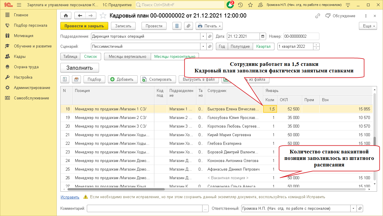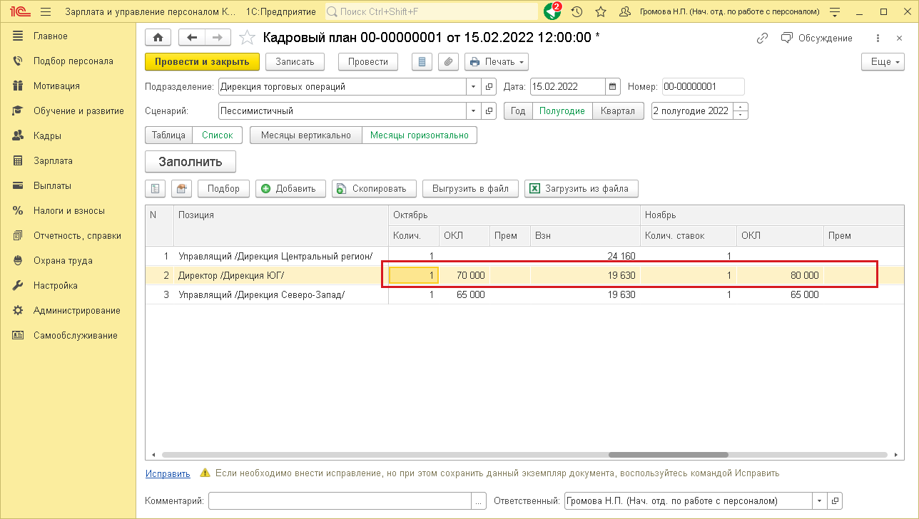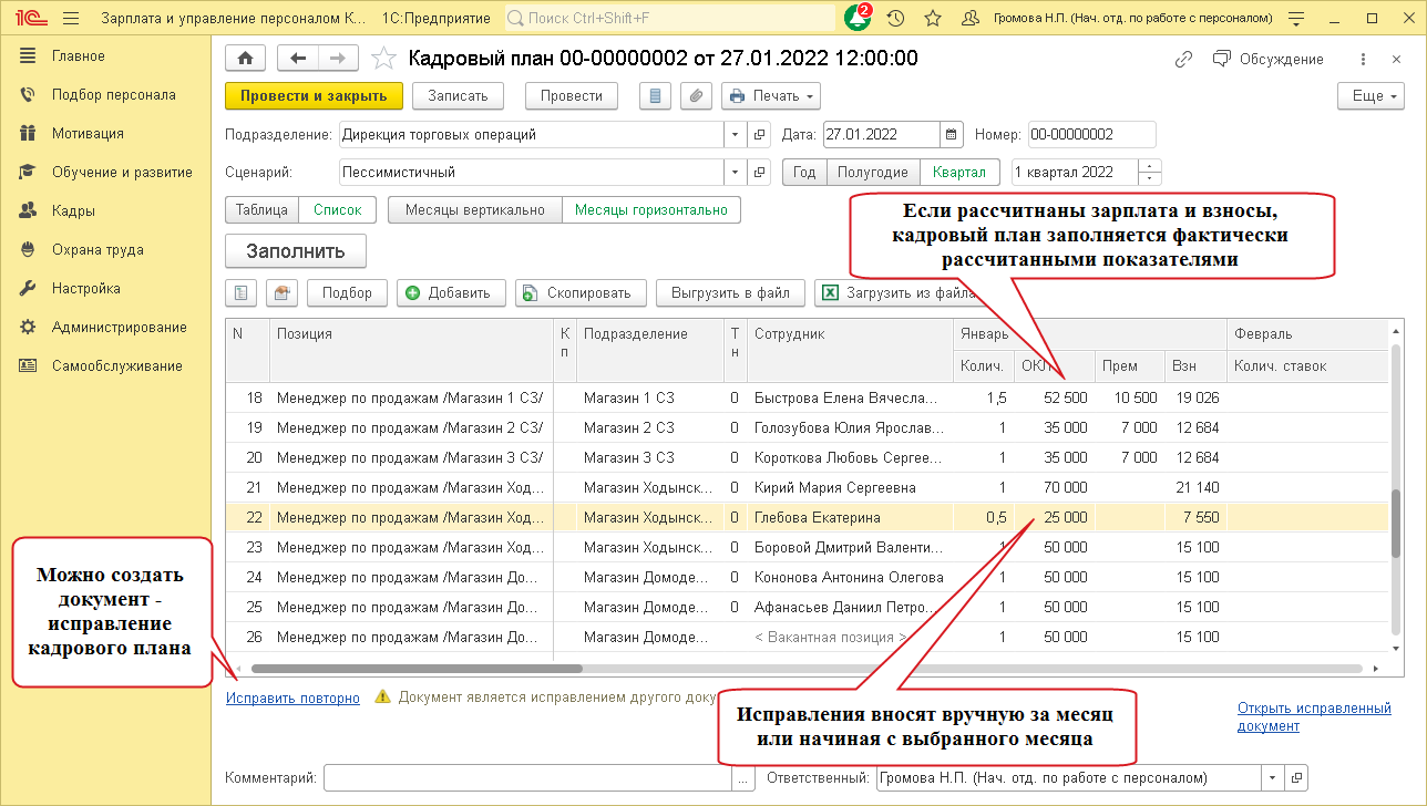 Если на момент исправления кадрового плана были рассчитаны зарплата и взносы, план заполняется фактически начисленными показателями.