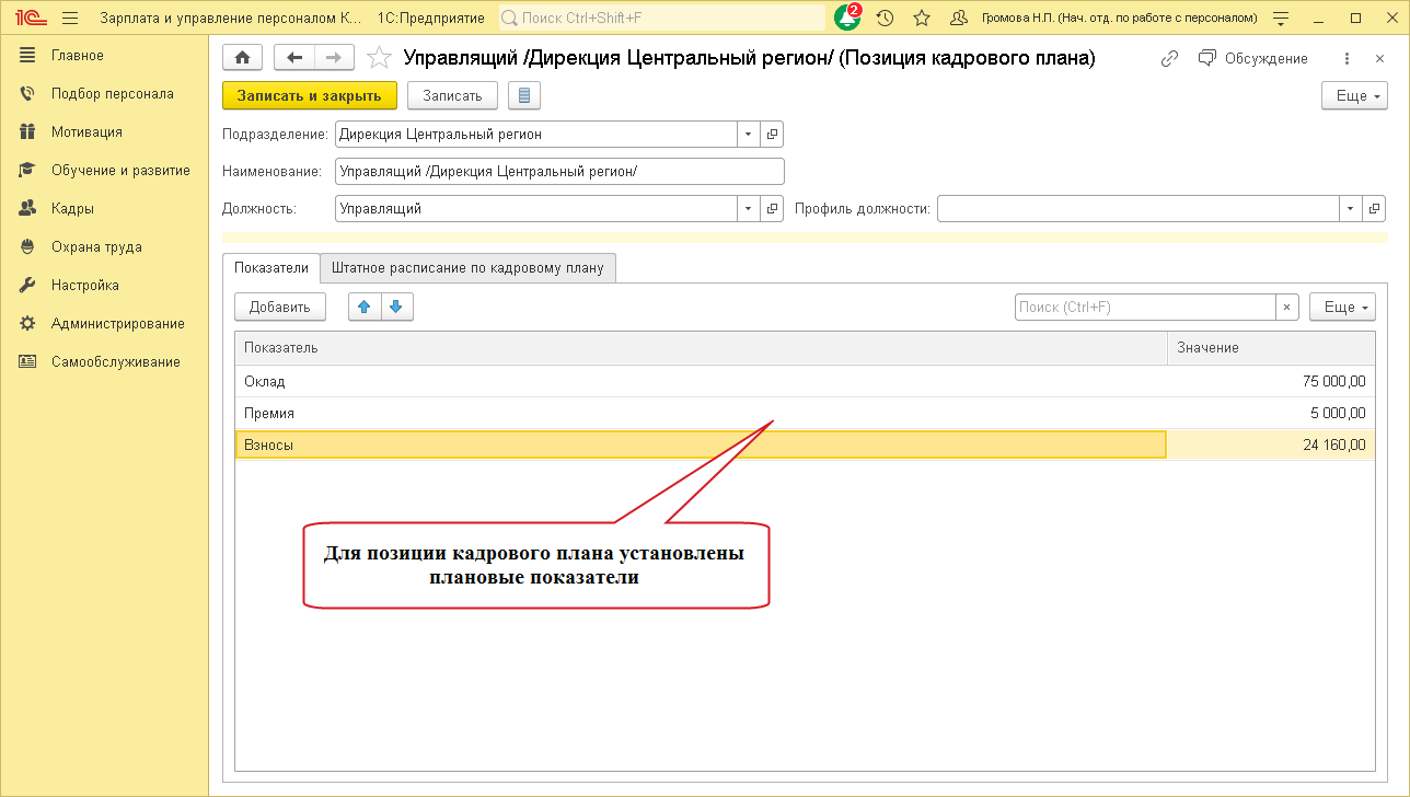 Например, добавим в план позицию, для которой нет соответствующей позиции штатного расписания. В карточке такой позиции указаны плановые показатели.