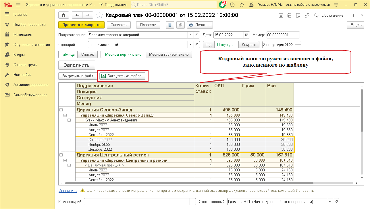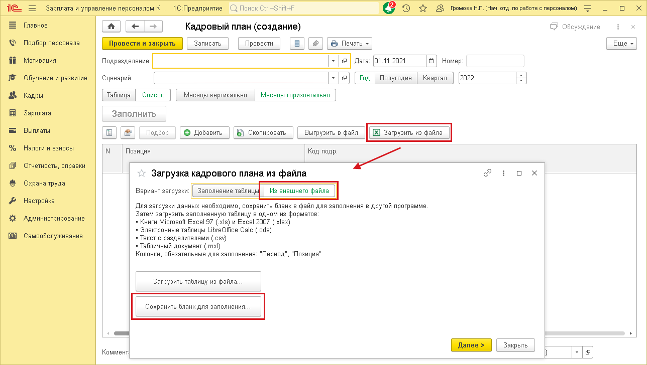 Возможна загрузка Кадрового плана из внешнего файла. Для корректной загрузки файл заполняют данными по шаблону.