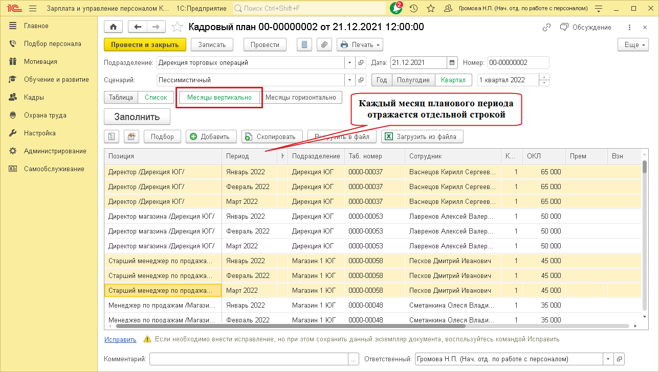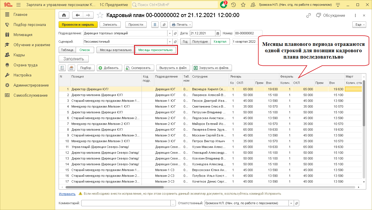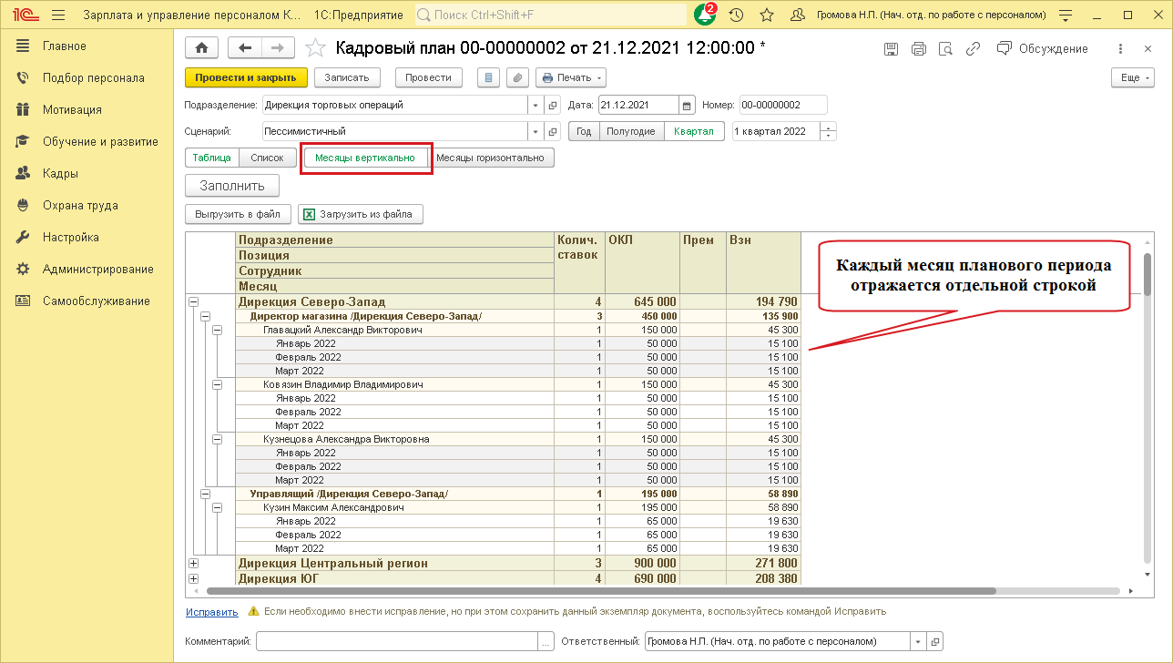 В режиме просмотра кадрового плана Месяцы вертикально каждый месяц планового периода с его показателями выводится отдельной строкой.