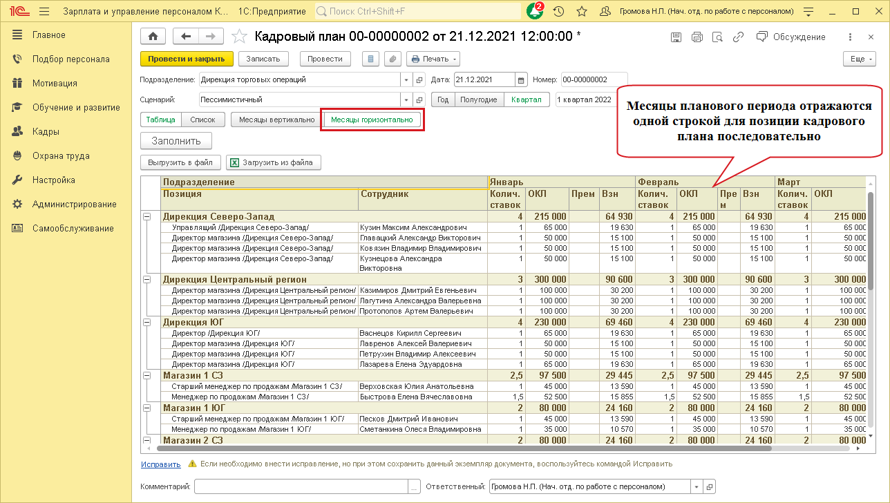 В режиме Месяцы горизонтально для позиции кадрового плана месячные показатели отображаются в столбцах таблицы.