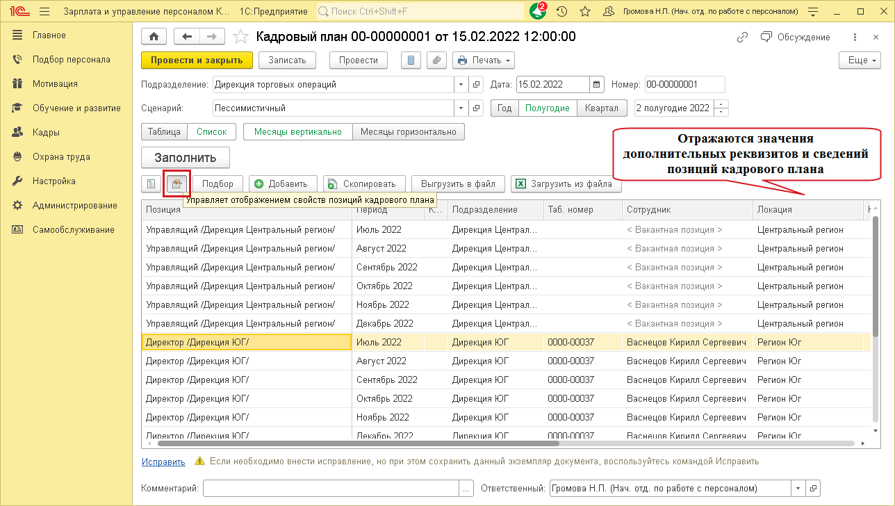 При нажатии кнопки Управляет отображением свойств позиций кадрового плана в отдельных колонках выводятся дополнительные реквизиты и сведения позиций.