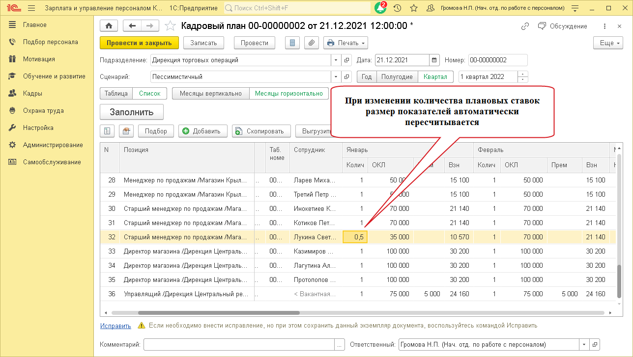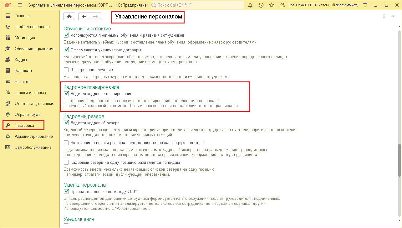 Администратор в Настройка / Управление персоналом включает опцию Ведется кадровое планирование