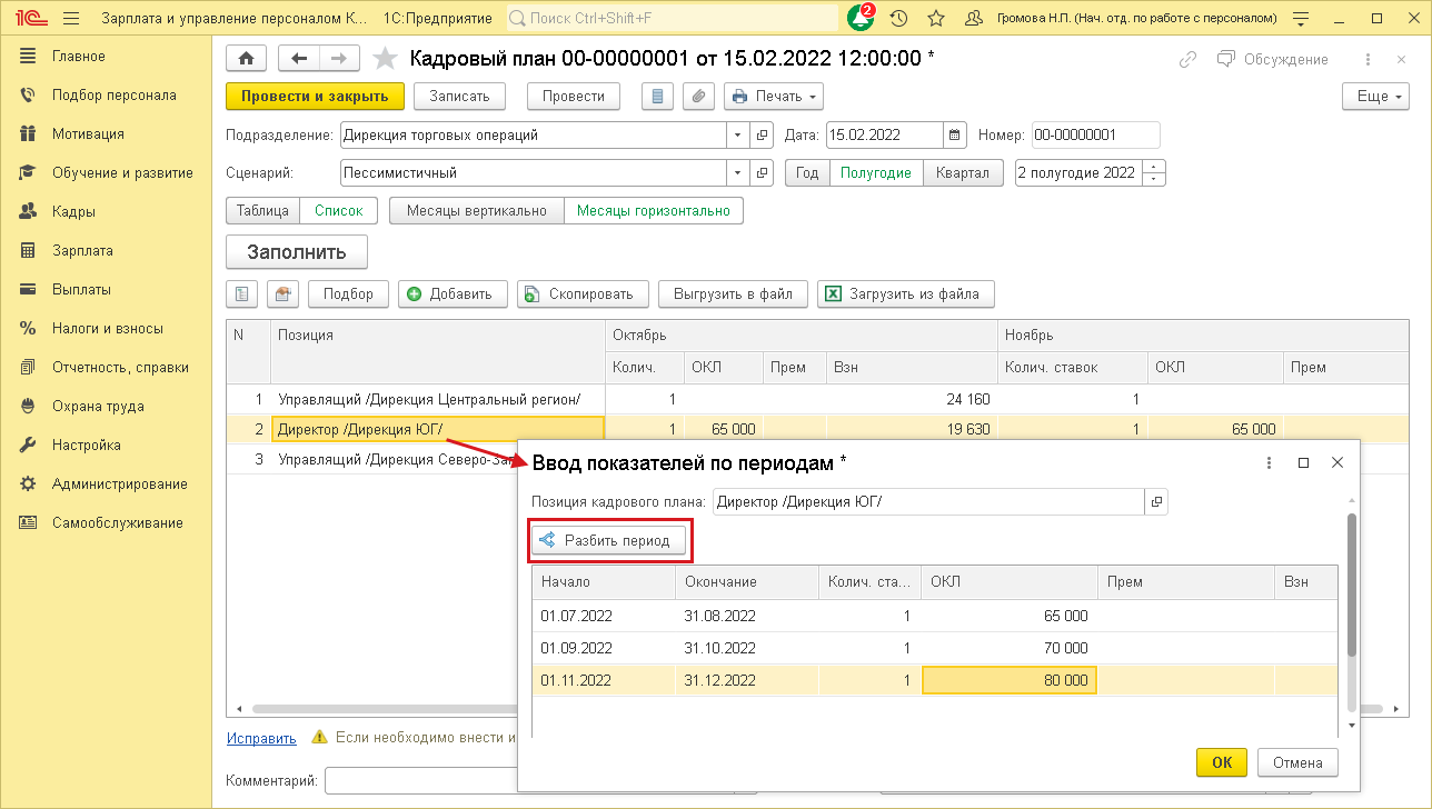Для этого плановый период можно разбить на несколько интервалов и указать для них разные значения показателя. Например, оклад Директора Дирекции ЮГ во втором полугодии планируется повысить с 1 сентября - 70 000 руб., с 1 ноября - 80 000 руб.