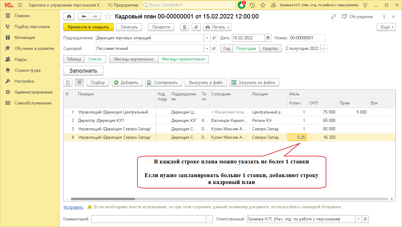 В одной строке кадрового плана для позиции можно указать не больше 1 ставки. Чтобы запланировать больше ставок, следует добавить еще строки в кадровый план.