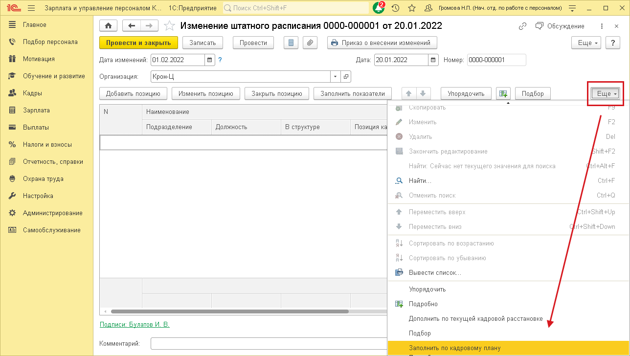 Если количество ставок различаются в кадровом плане и штатном расписании, документ Изменение штатного расписания можно заполнить по данным кадрового плана.