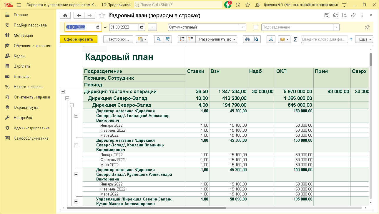 Отчет выводит за период кадровый план, для позиции кадрового плана месячные показатели отображаются одной строкой.
