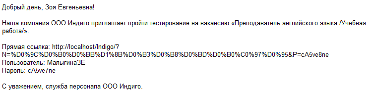 Кандидат приходит в офис компании. На электронную почту кандидату высылают приглашение пройти электронное тестирование. В письме указаны: