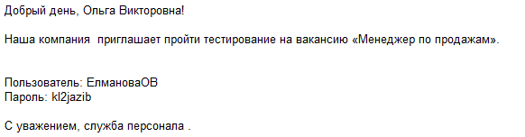 Кандидат получает на электронную почту приглашение пройти электронное тестирование. В письме указаны: