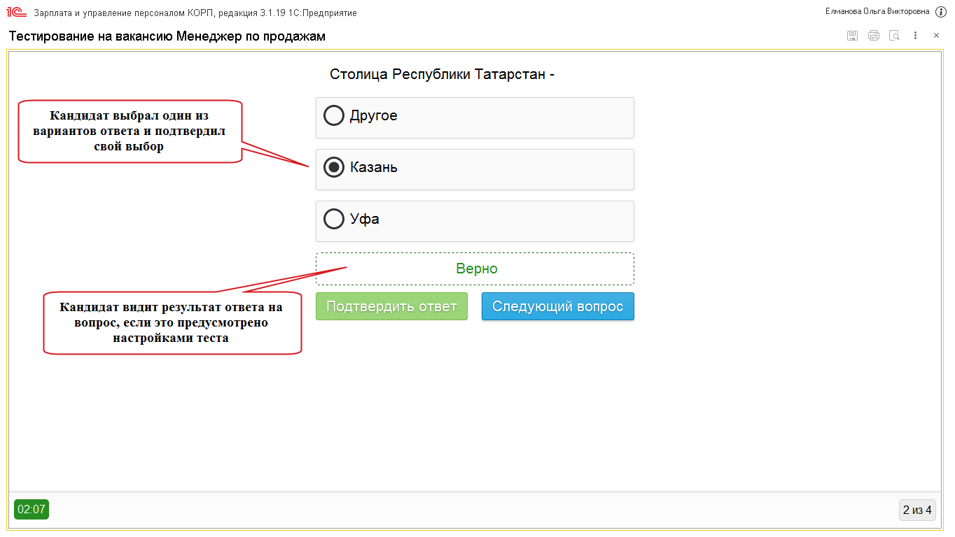 Кандидат отвечает на вопросы теста, подтверждает свой ответ. Он видит, верно он ответил на вопрос, или допустил ошибку, если такая опция включена в настройках. Программа показывает время, оставшееся на тестирование, порядковый номер вопроса и количество вопросов теста.