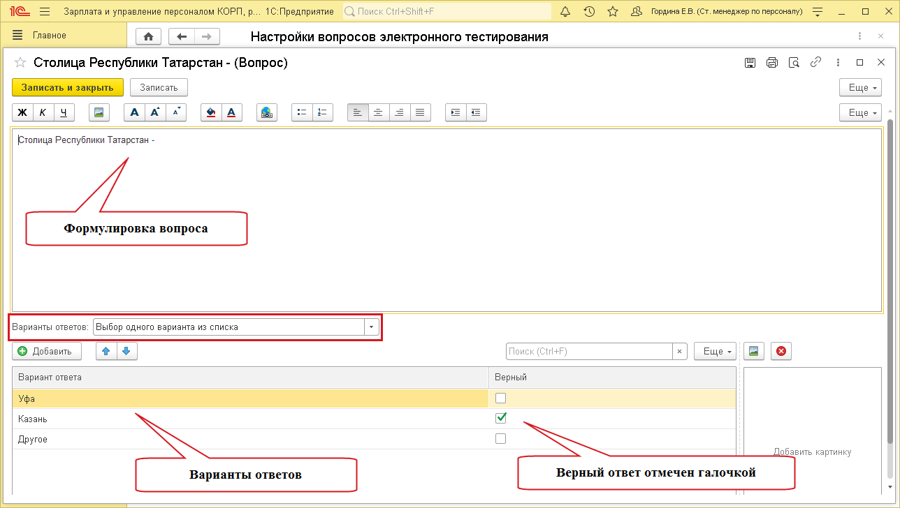 Настройка. Вопрос содержит формулировку, варианты ответов - Выбор одного варианта из списка, перечислены варианты ответов, верный ответ отмечен зеленой галочкой.