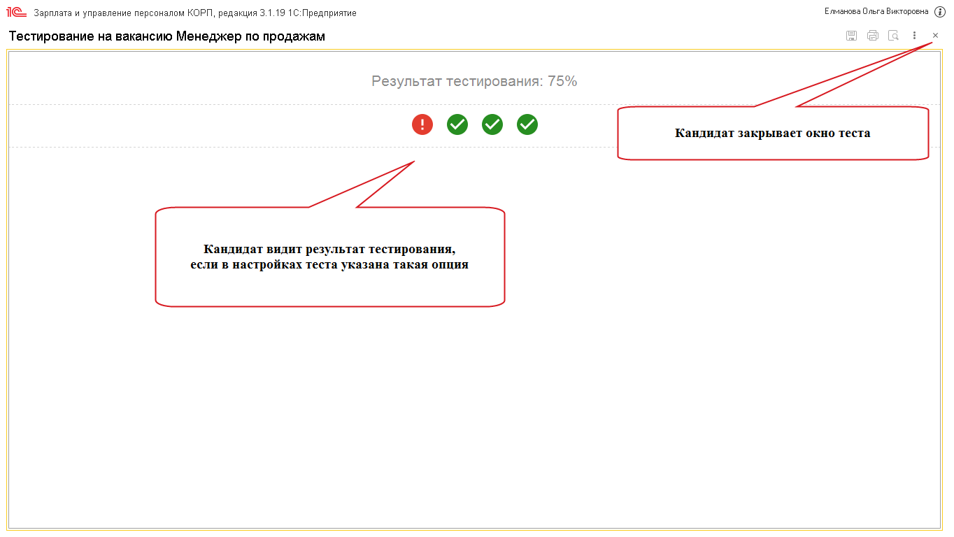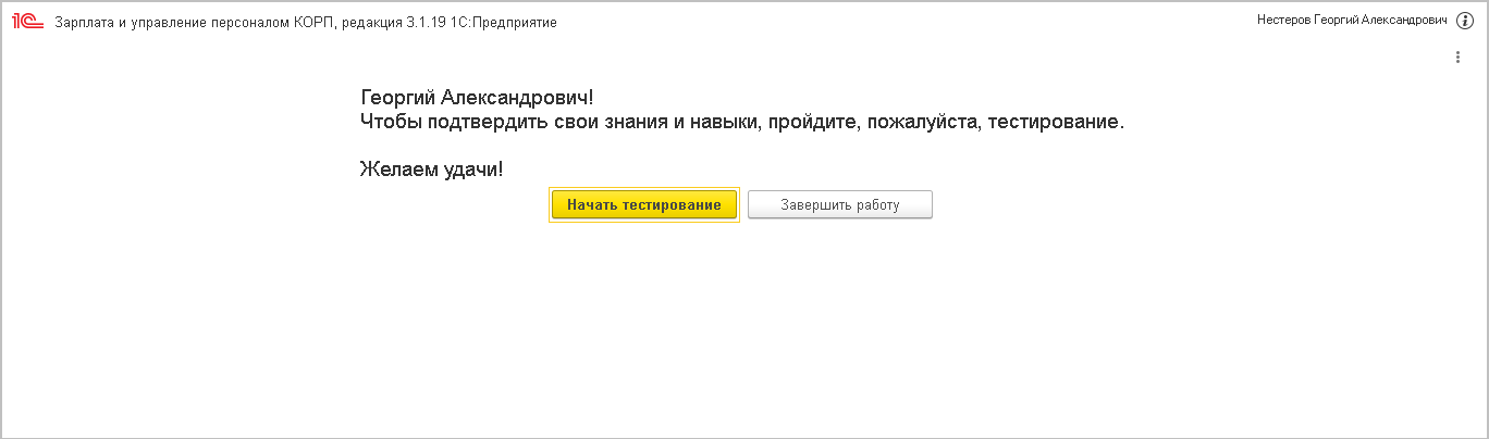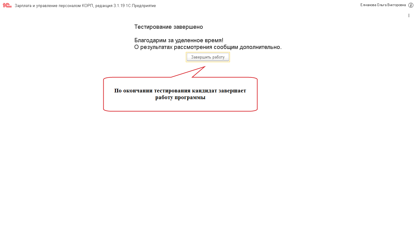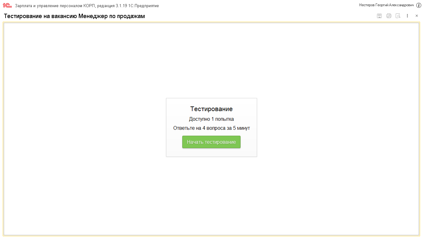 Кандидат садится за компьютер, вводит в окне запуска логин и пароль. Открывается 1С:ЗУП КОРП в полноэкранном режиме. Кандидат отвечает на вопросы теста.