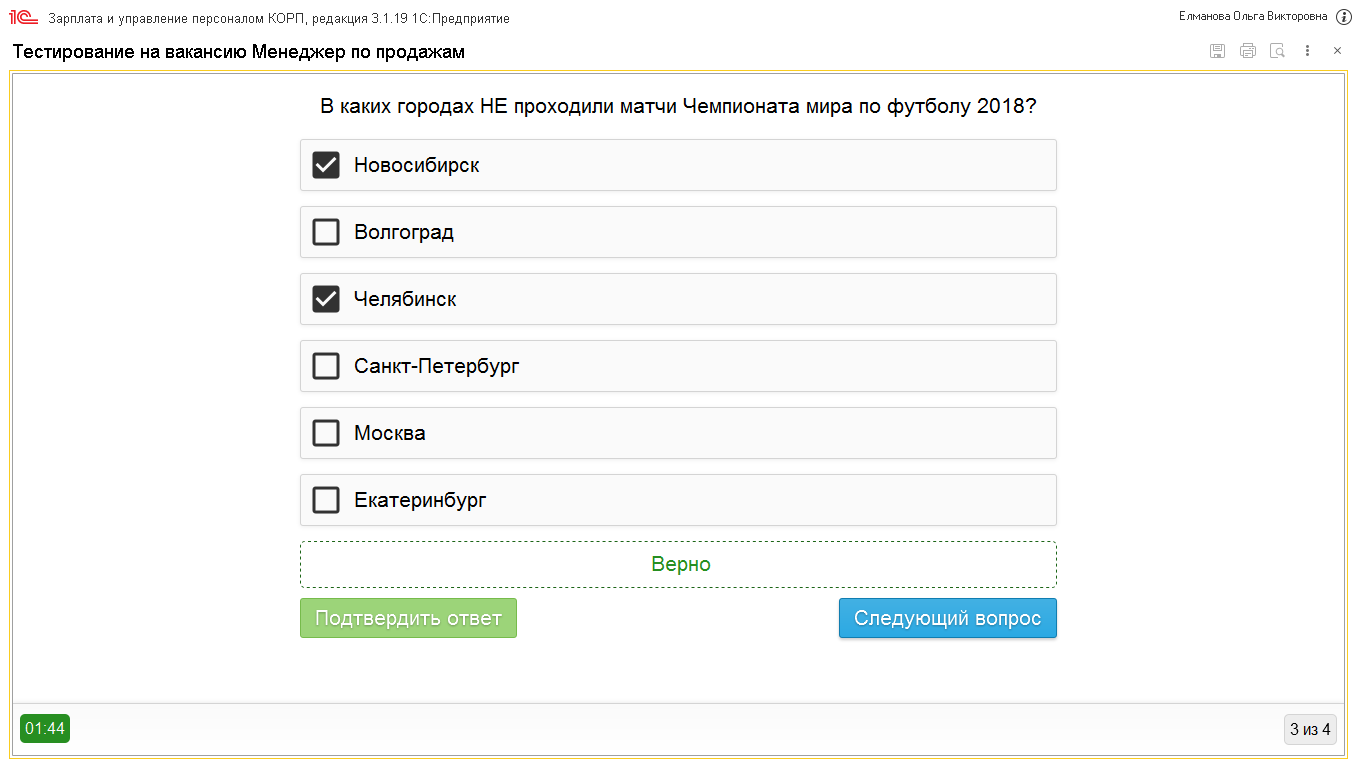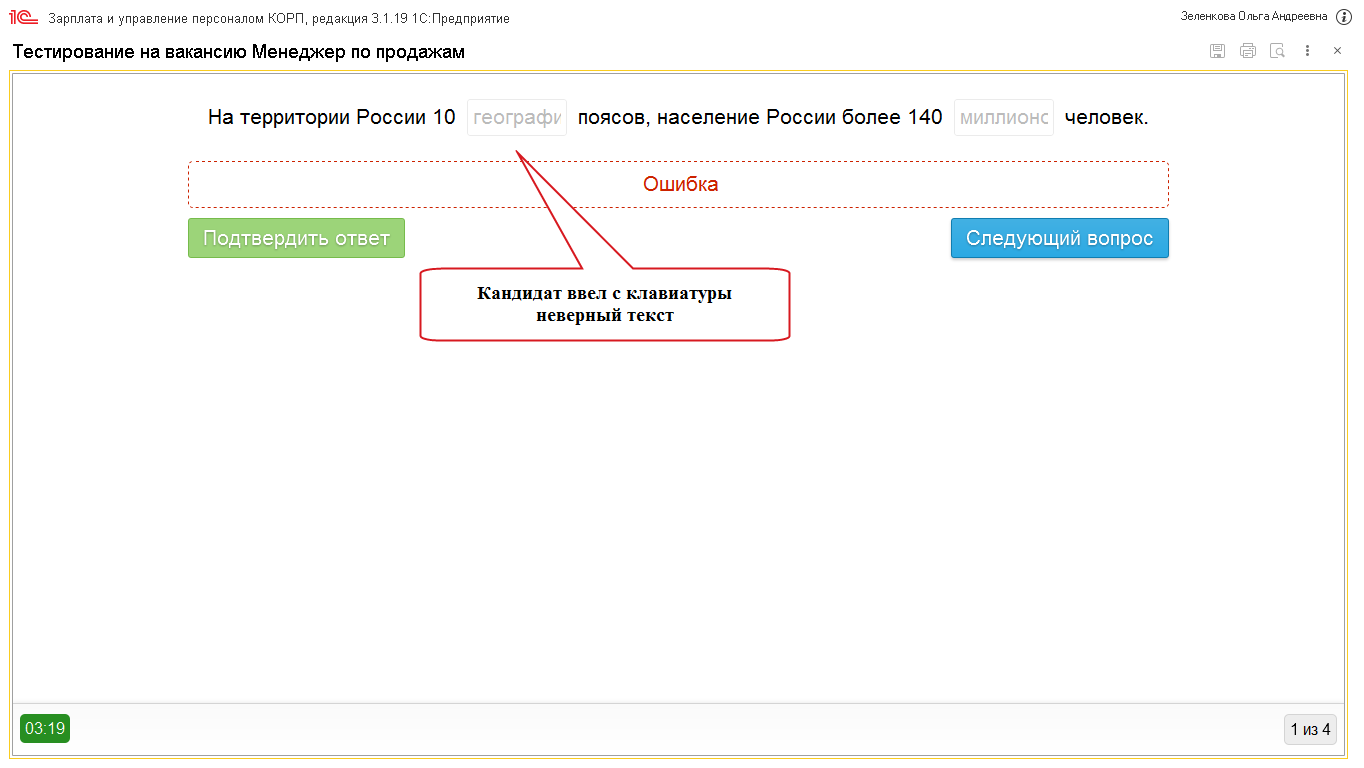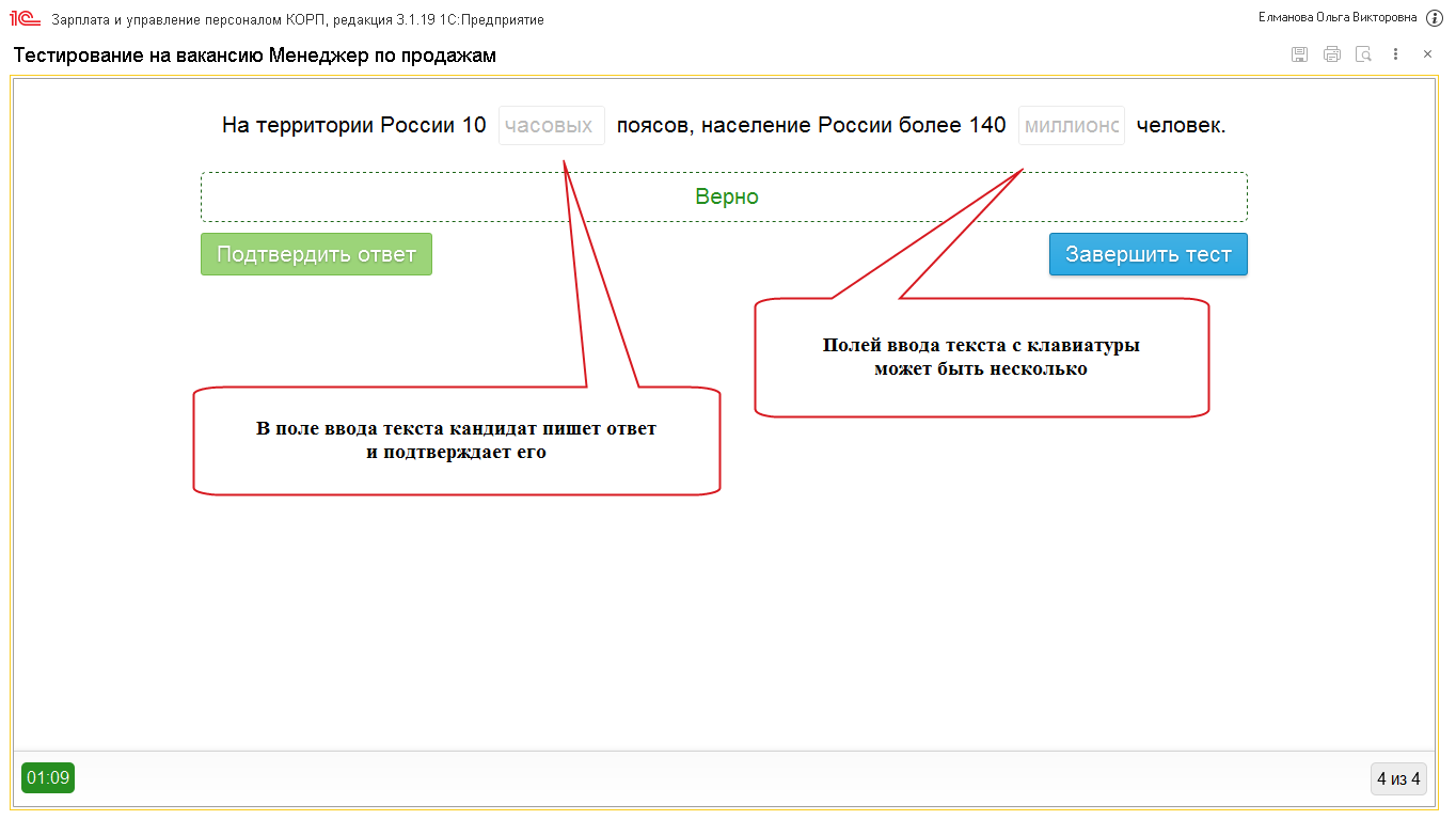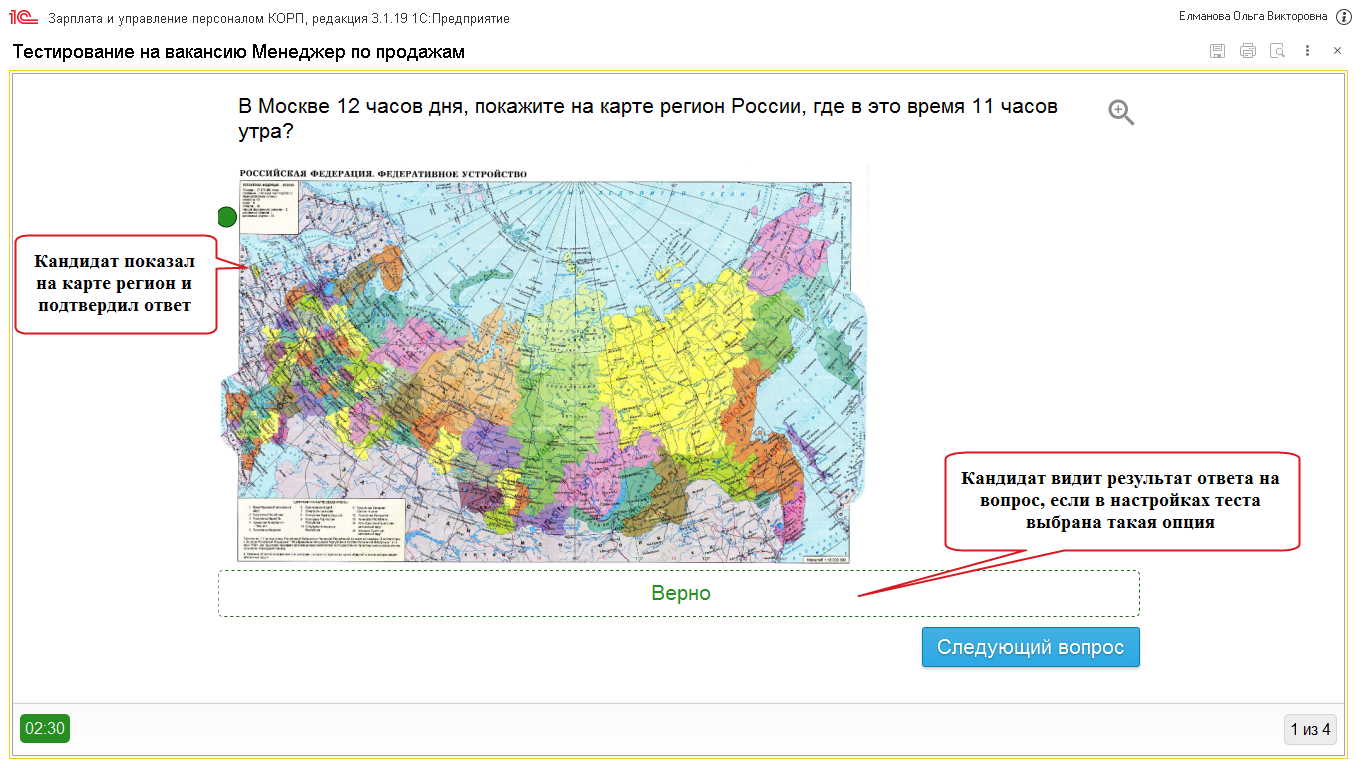 Кандидат садится за компьютер, вводит в окне запуска логин и пароль. Открывается 1С:ЗУП КОРП в полноэкранном режиме. Кандидат отвечает на вопросы теста.