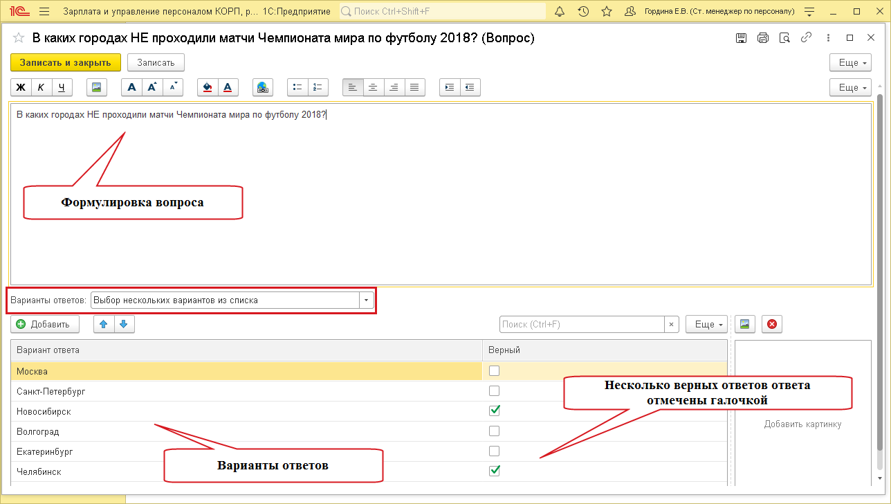 Настройка. Вопрос содержит формулировку, варианты ответов - Выбор нескольких вариантов из списка, перечислены варианты ответов, несколько верных ответов отмечены зелеными галочками.