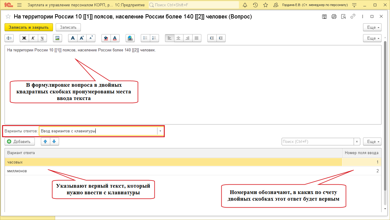При ответе на вопрос такого типа нужно в одном или нескольких местах формулировки ввести с клавиатуры правильный текст. Ответ на вопрос будет считаться верным, если во всех местах формулировки написан правильный текст.