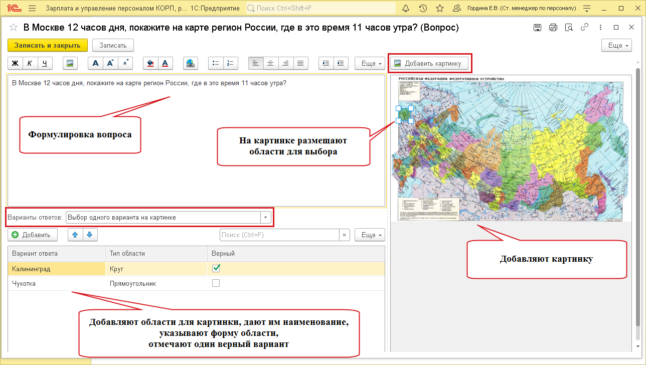 Настройка. Вопрос содержит формулировку, варианты ответов - Выбор одного варианта на картинке. Загружают картинку, в список вариантов ответа добавляют области (одну или несколько), дают им наименование, указывают форму области (круг или квадрат), отмечают галочкой верный вариант ответа. Области размещают на картинке.