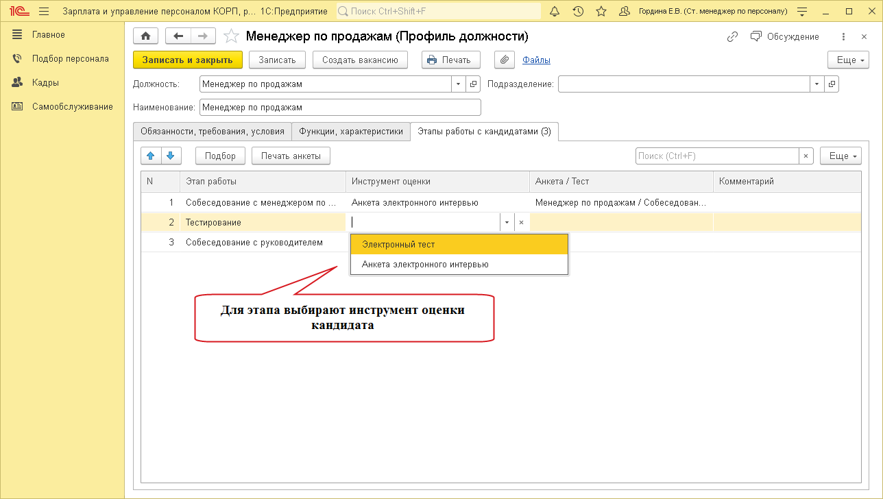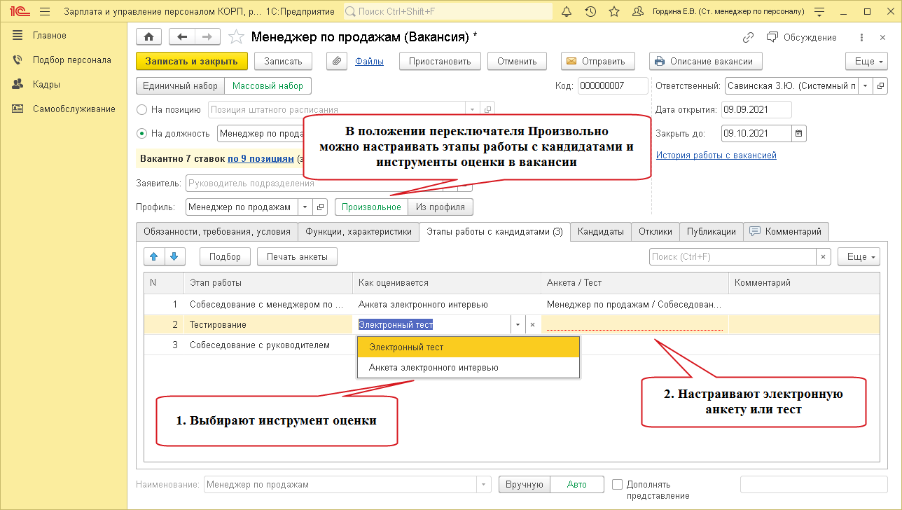 Настройку или выбор ранее настроенного электронного теста выполняют в Подбор персонала / Профиль должности или на форме Подбор персонала / Вакансии. Если инструменты оценки настраивают в вакансии, предварительно переключатель переводят в положение Произвольно.