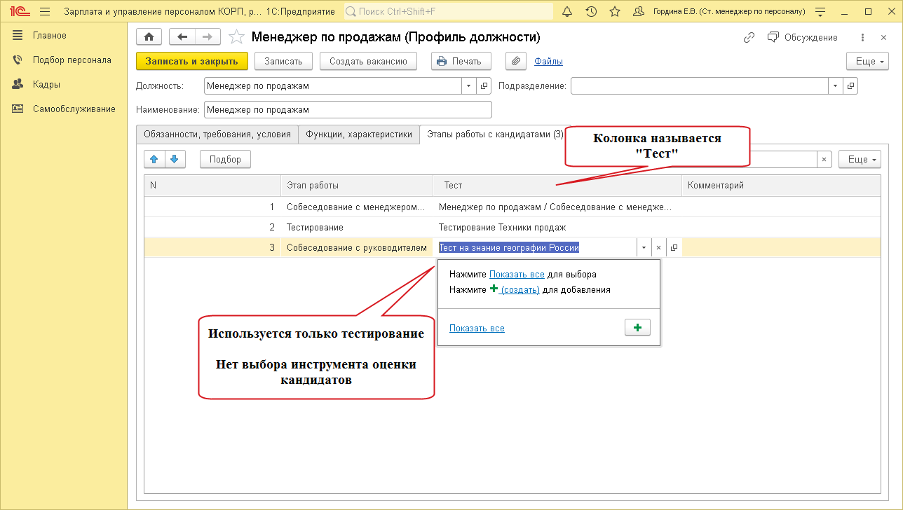 Чтобы включить тест на каком-либо этапе подбора на вакансию, в Вакансии или Профиле должности выполняют действия: