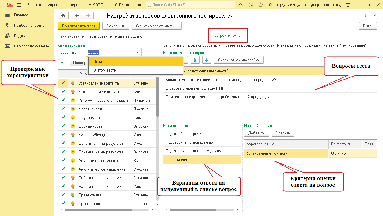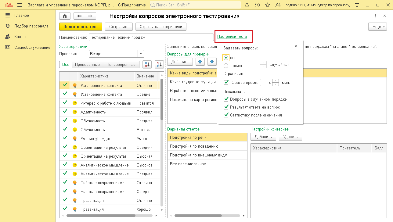 Если вопросы данного теста должны проверять другие характеристики и по другим критериям, следует выполнить новые настройки в разделе Настройки критериев.