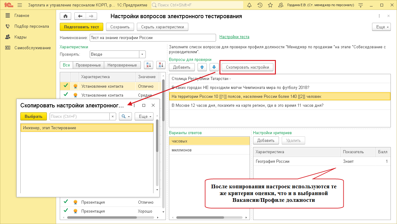 Если вопросы должны проверять те же характеристики, что и в исходном тесте, выполняют команду Скопировать настройки. Программа предлагает выбрать Профиль должности/Вакансию и этап, откуда следует скопировать критерии оценки ответов на вопросы. После этого для ответов на вопросы текущего теста используются те же критерии, что в выбранной Вакансии/Профиле должности. Критерии можно изменить и расширить.