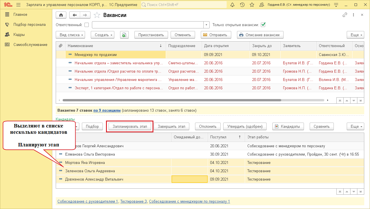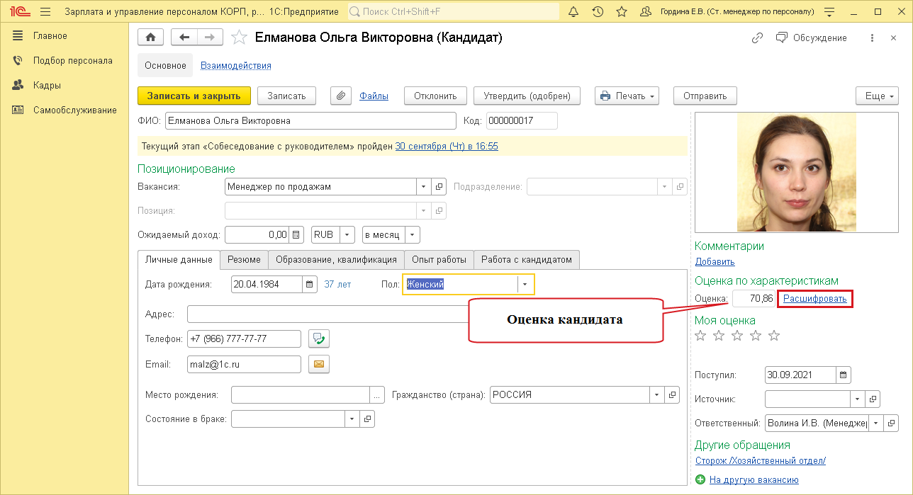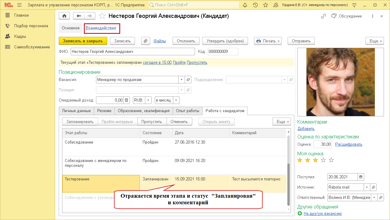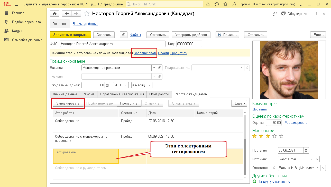 Этап работы с кандидатом в 1С:ЗУП КОРП автоматически отмечается пройденным.