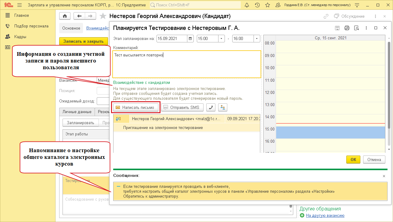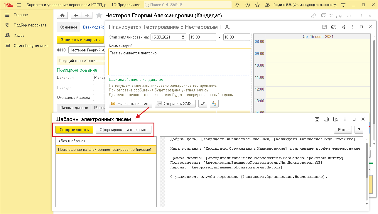 Написать сообщение кандидату можно по шаблону, который есть в 1С:ЗУП КОРП, или настроить собственный шаблон электронного письма.
