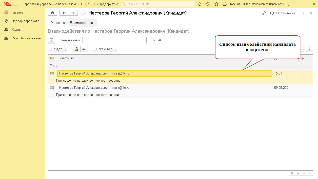 Сообщения, отправленные кандидату, доступны для просмотра в списке Взаимодействия карточки кандидата.